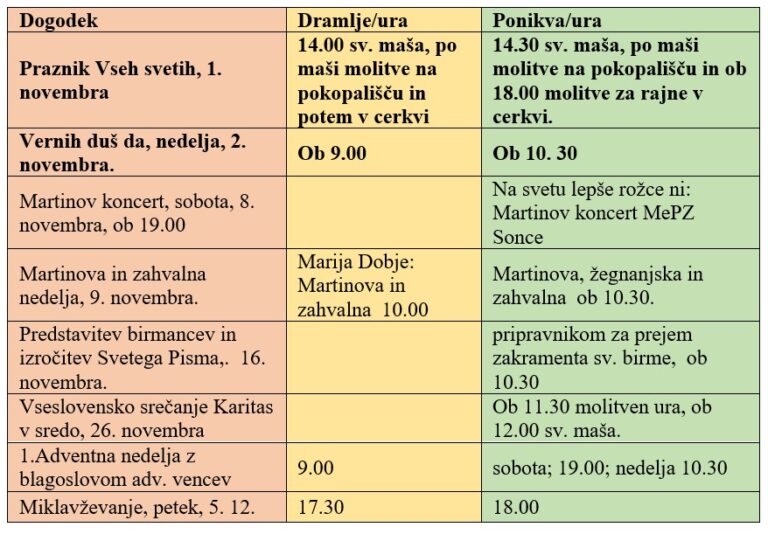 - Razpored bogoslužja v župniji Dramlje in Ponikva v novembru 2025