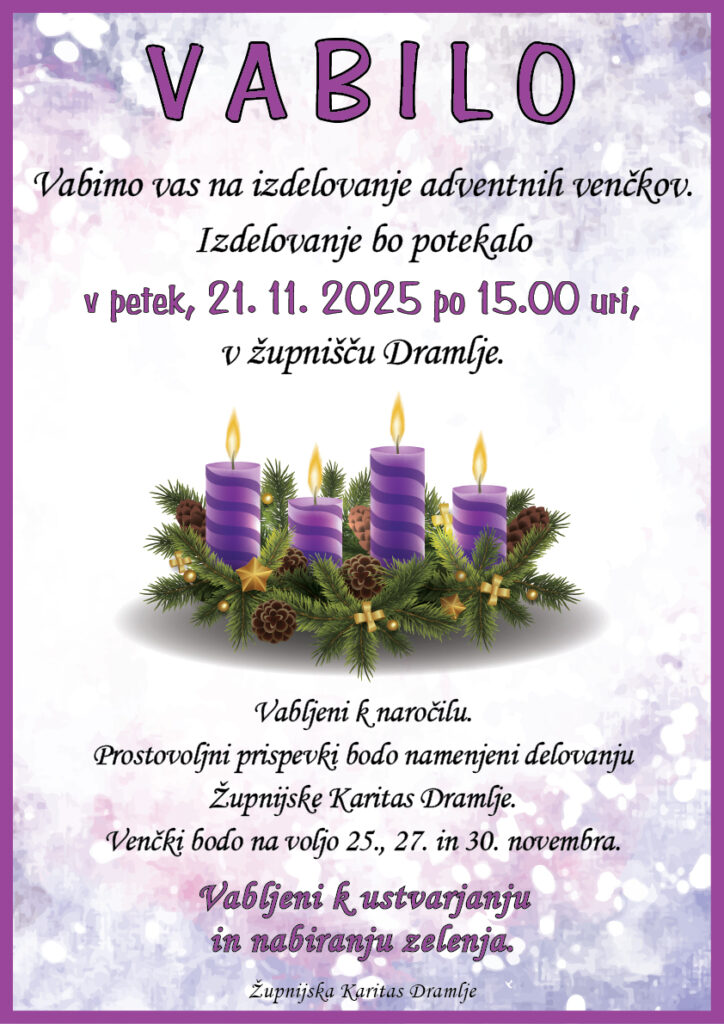 Župnijska Karitas Dramlje bo v župnišču v petek, 21. 11., od 15.00 ure dalje izdelovanje adventnih venčkov. Vabljeni k naročilu. Prostovoljni prispevki bodo namenjeni delovanju Župnijske Karitas Dramlje. Venčki bodo na voljo 25., 27. in 30. novembra. … [Preberite več…]