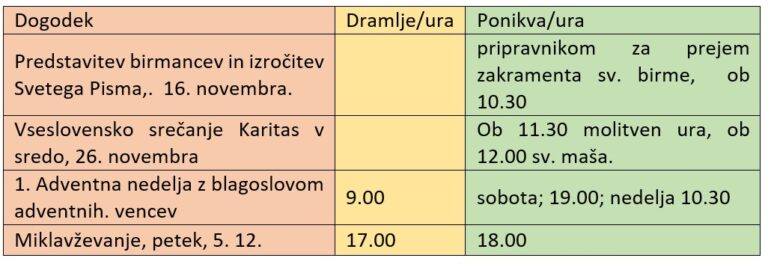 1. Razpored bogoslužja v župniji Dramlje in Ponikva v novembru in decembru