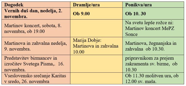 - Razpored bogoslužja v župniji Dramlje in Ponikva v novembru 2025: