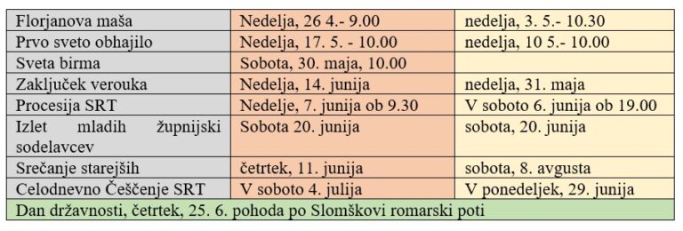 V torek, 5. maja se prične tridnevna priprava 24. družin prvoobhajancev na praznik prvega svetega obhajila. Ob 19.00 se zberemo pri sveti maši, po maši sledijo še praktične vaje. V petek, 8. maja bodo prvoobhajanci pristopili v dveh skupinah k sveti spovedi. Slovesnost prvega svetega obhajila bo v nedeljo, 10. maja ob 10.00. Teden pozneje sledi podobna priprava za župnijo Dramlje za 16 družin.